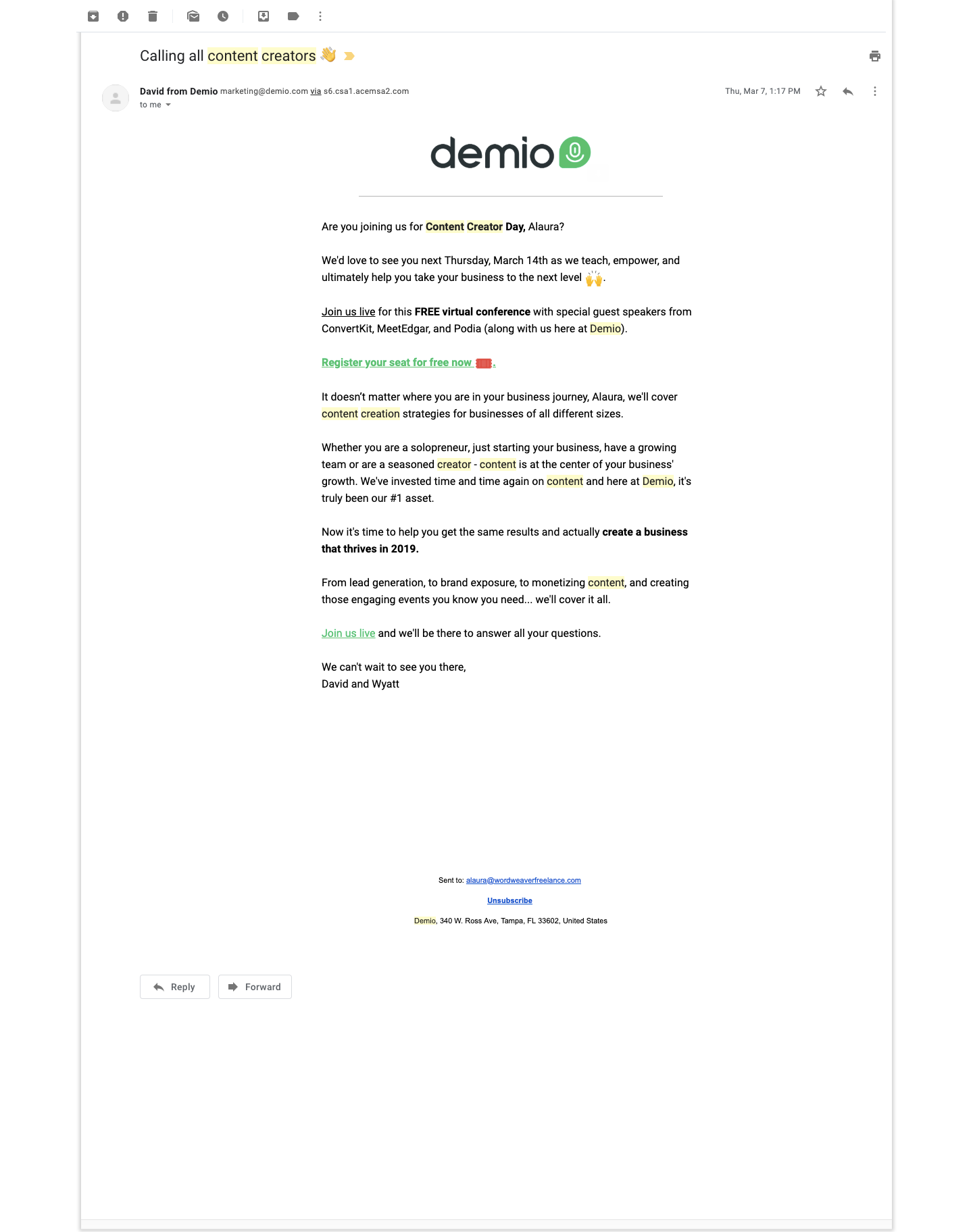 TimelineEmail SentLead Registers for EventRegistration ConfirmationDay of Event (before)Day-of ReminderDay of Event (after)Thank YouDay After EventContent1-2 Days After EventSurvey1-3 Days After EventPersonal1-7 Days After EventMeetingsource: Demio